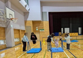 部屋で遊んだ後は体育館に移動し、学生さんとふれいあい遊び、しっぽとり、サーキット遊びをしました。