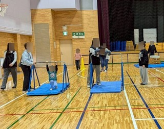 鉄棒は、苦手なお子さんが多いと聞いていましたが、ぶら下がりをしたり、前回りをしたり挑戦しようとする姿がたくさん見られました。
