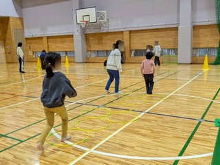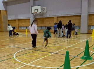 最初に全員で動物の動きを真似する遊びやフープとコーンにタッチする遊びを行いました。
