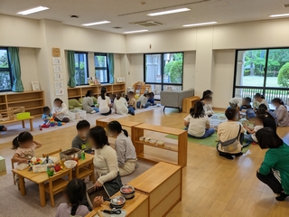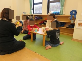 ボランティアさん達とおもちゃで遊んだ後、みんなで集まり、リズム遊びを行いました。