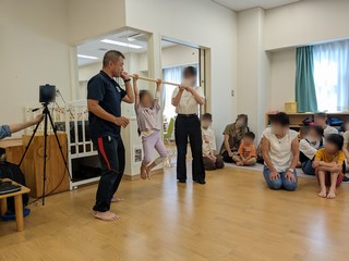 私も参加したので写真を撮れませんでしたが、子どもは寝転んだ状態で棒を掴み、足を身体の方に上げると同時に、棒を上に引っ張ると逆上がりができます。