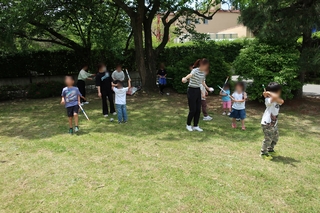 その後は、芝生ひろばで遊びました。「エビカニクス」体操をしたり、新聞棒を使って遊びました。