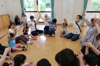 その後は「あるく」「じゃんぷする」などの絵カードを見ながら、身体を動かして遊びました。最後はみんなで手をつないで大きな円ができました。