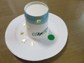 芝生ひろばで遊んだ後は、お部屋に戻り、ボランティアさんと紙コップを使った「かえる」の製作をしたり絵本を読んでもらいプログラム終了となりました。