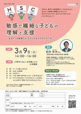 - 小野市にあるうるおい交流館エクラで、「敏感で繊細な子ども理解と支援」をテーマに講演させていただきました。当日はたくさんの方々にお越しいただきありがとうございました。HSCの関心の高さを改めて感じました。話の内容が少しでも皆さんのお役に立てば幸いです。